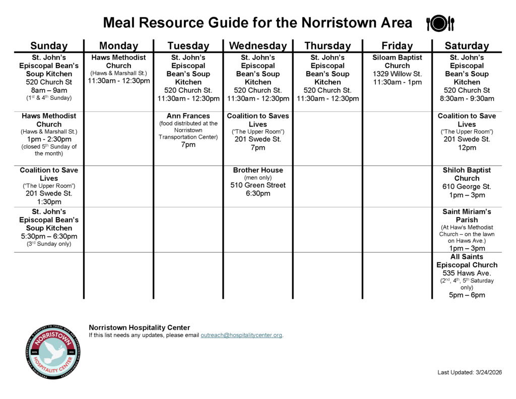 The Hospitality Center created a handy, two page “Local Resource Guide for the Norristown Area” filled with resources for those facing challenges. This guide connects you with essential services available throughout Montgomery County like housing, food pantries, medical care, and more. The “Meal Resource Guide for the Norristown Area,” outlines where food is available each day of the week.