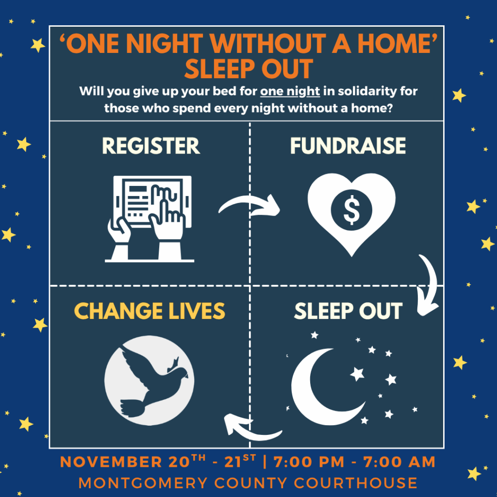 The “One Night Without a Home” Sleep Out is part of Hunger and Homelessness Awareness Week. This event is an opportunity for participants to spend a night outside to discuss, think, and learn about homelessness. Although one night outside can in no way simulate homelessness, this awareness-raising activity can promote advocacy, awareness, and education.