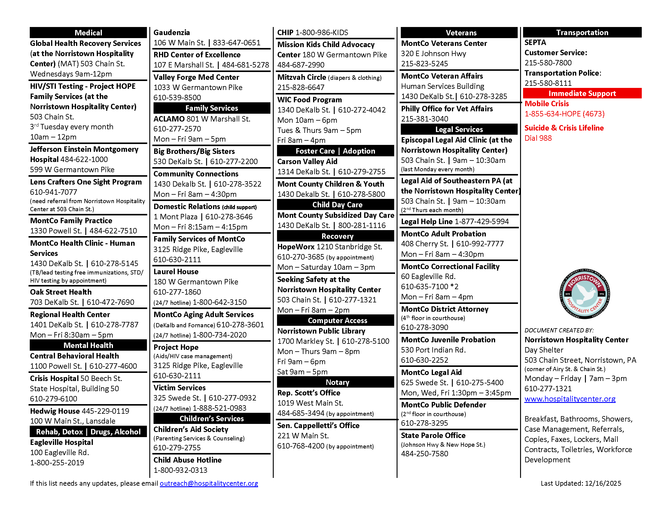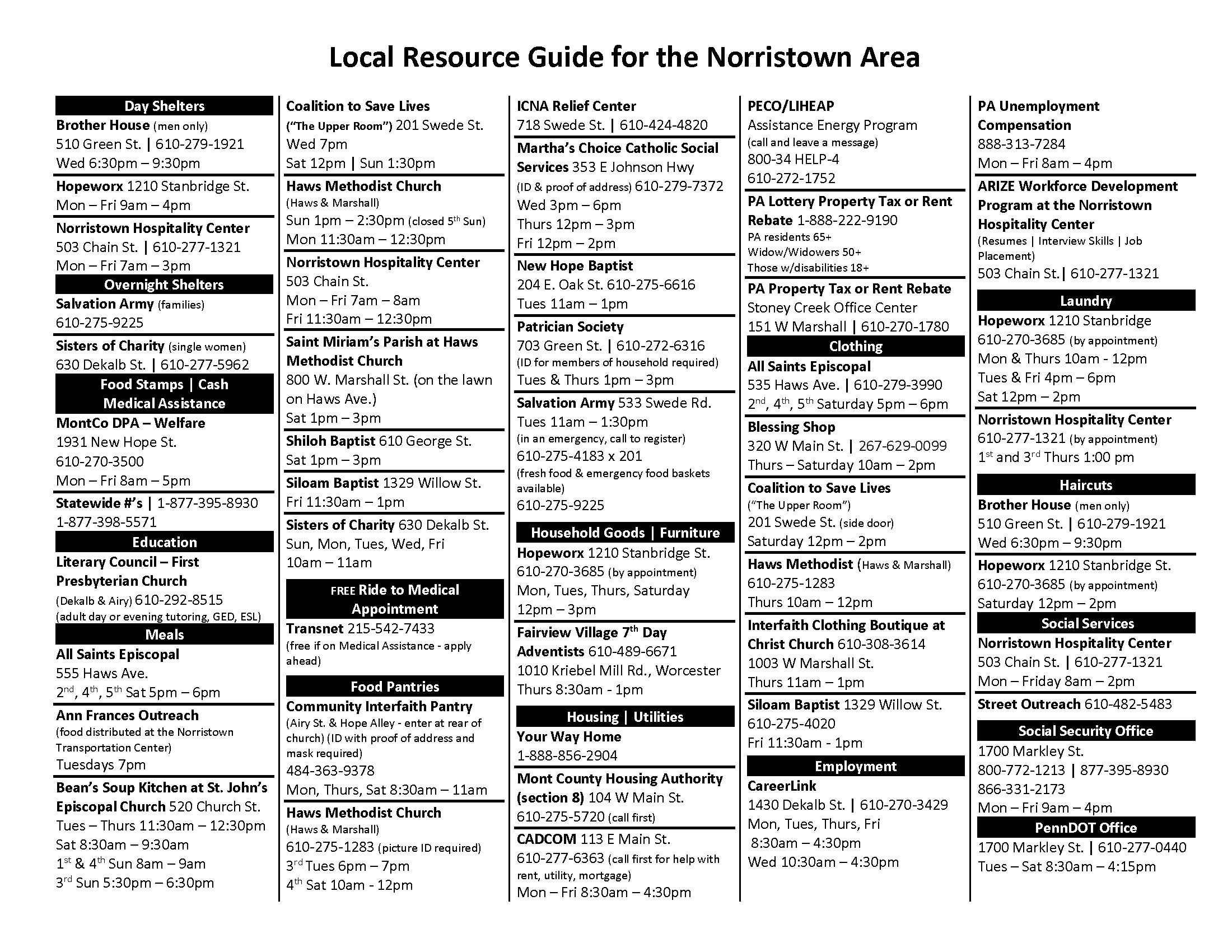 The Hospitality Center created a handy, two page “Local Resource Guide” filled with resources for those facing challenges. This guide connects you with essential services available throughout Montgomery County like housing, food pantries, medical care, and more. The “Meal Resource Guide for the Norristown Area,” outlines where food is available each day of the week.